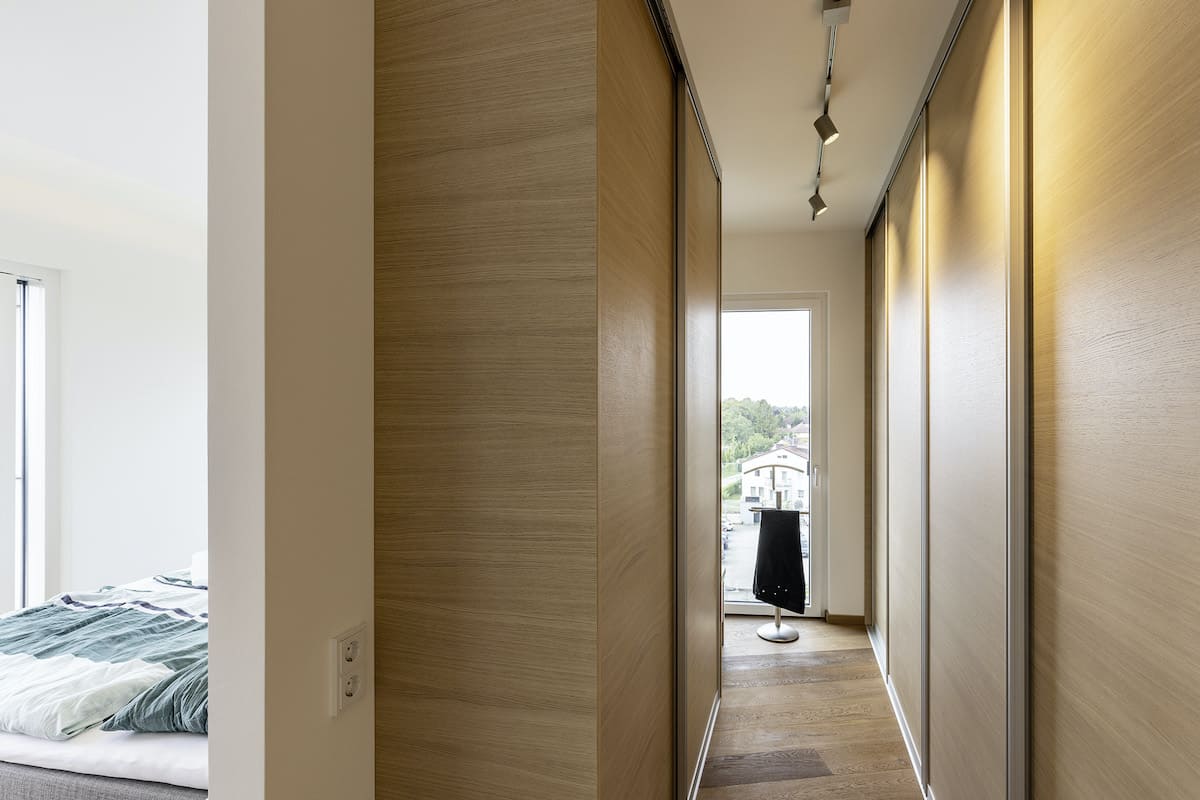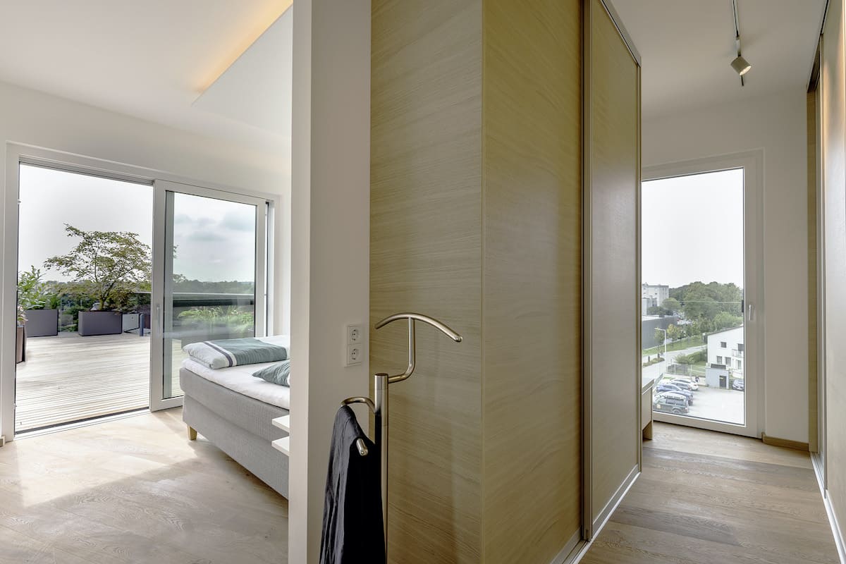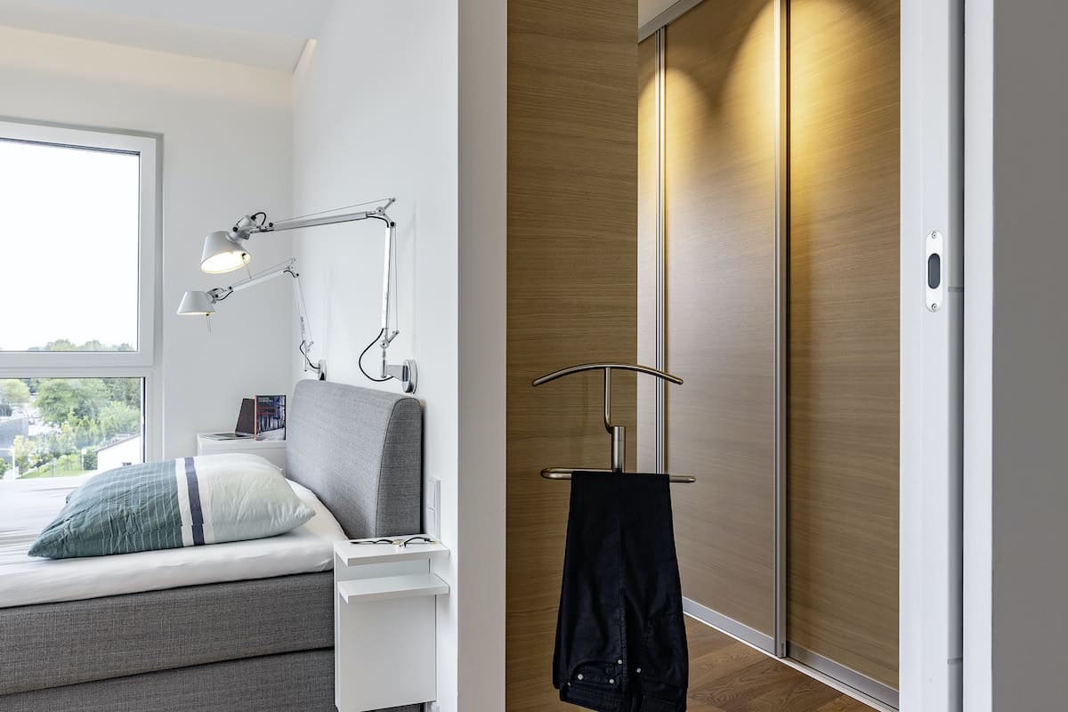„Das Schlafzimmer ist gut geplant, schlicht und einfach schön. Hinter dem Schlafraum befindet sich ein Schrankraum, der sehr effizient gestaltet wurde. Man bringt hier Unmengen an Sachen unter, weil es durch die geschickte Planung so viel Stauraum gibt.“