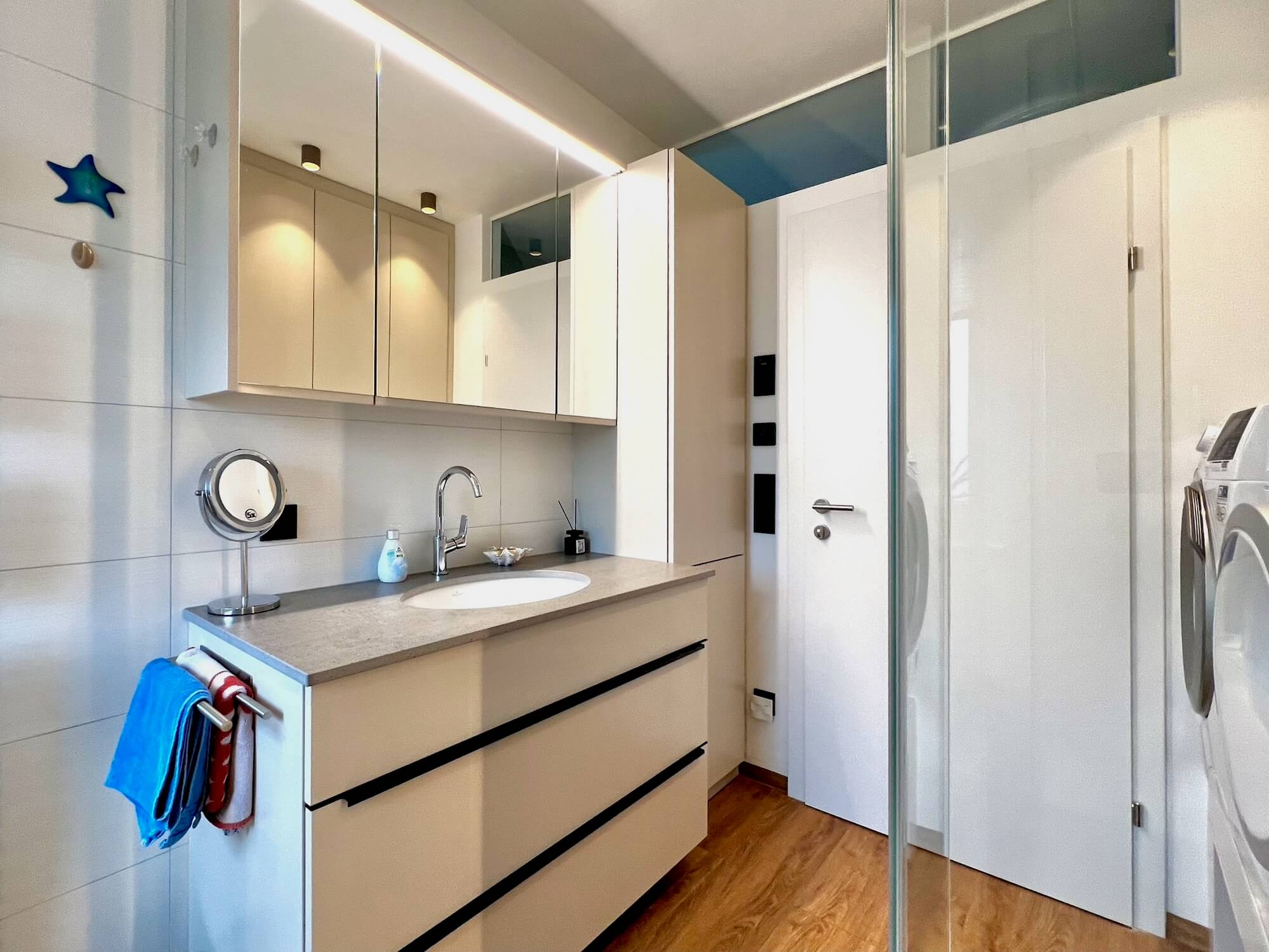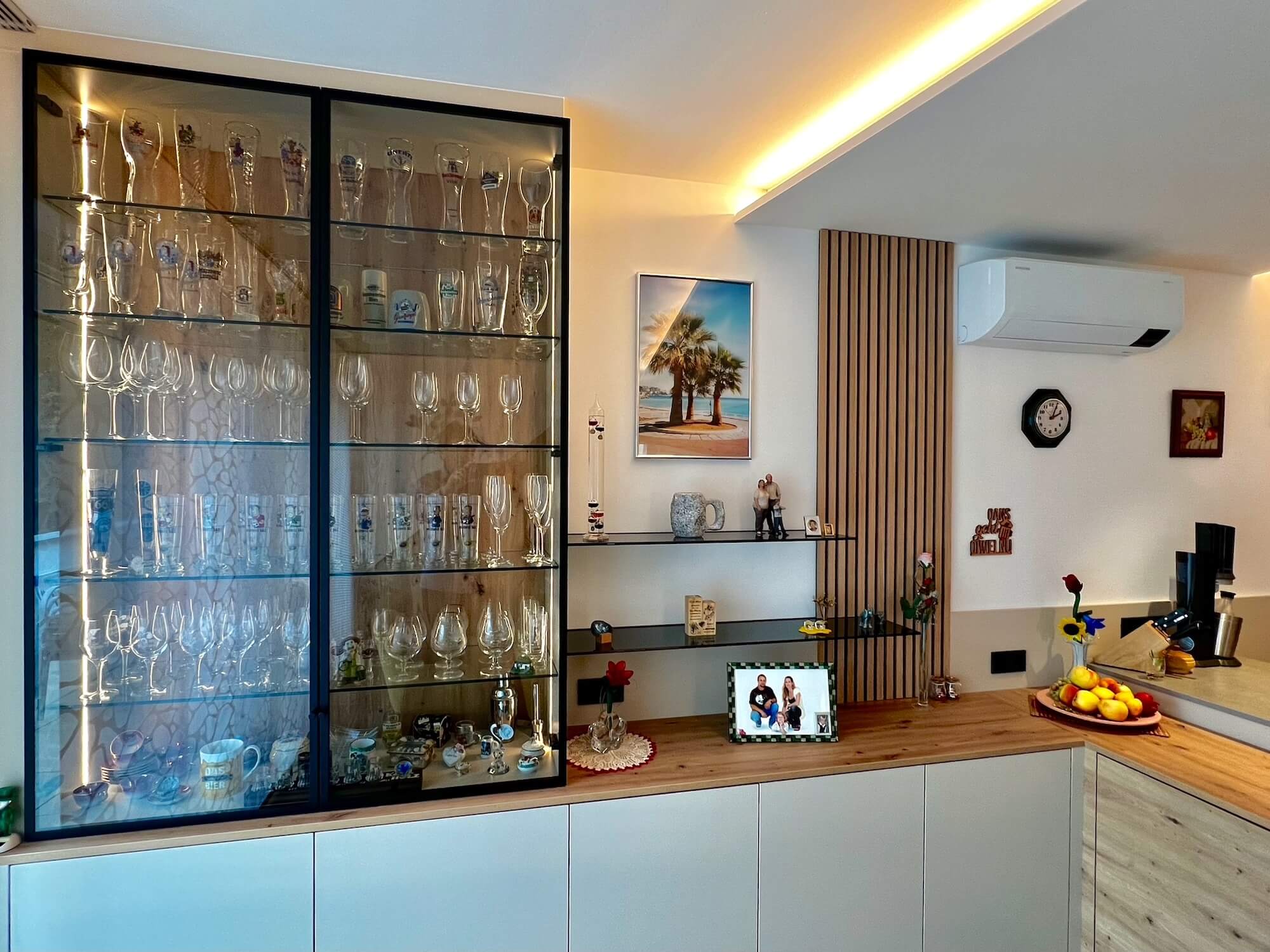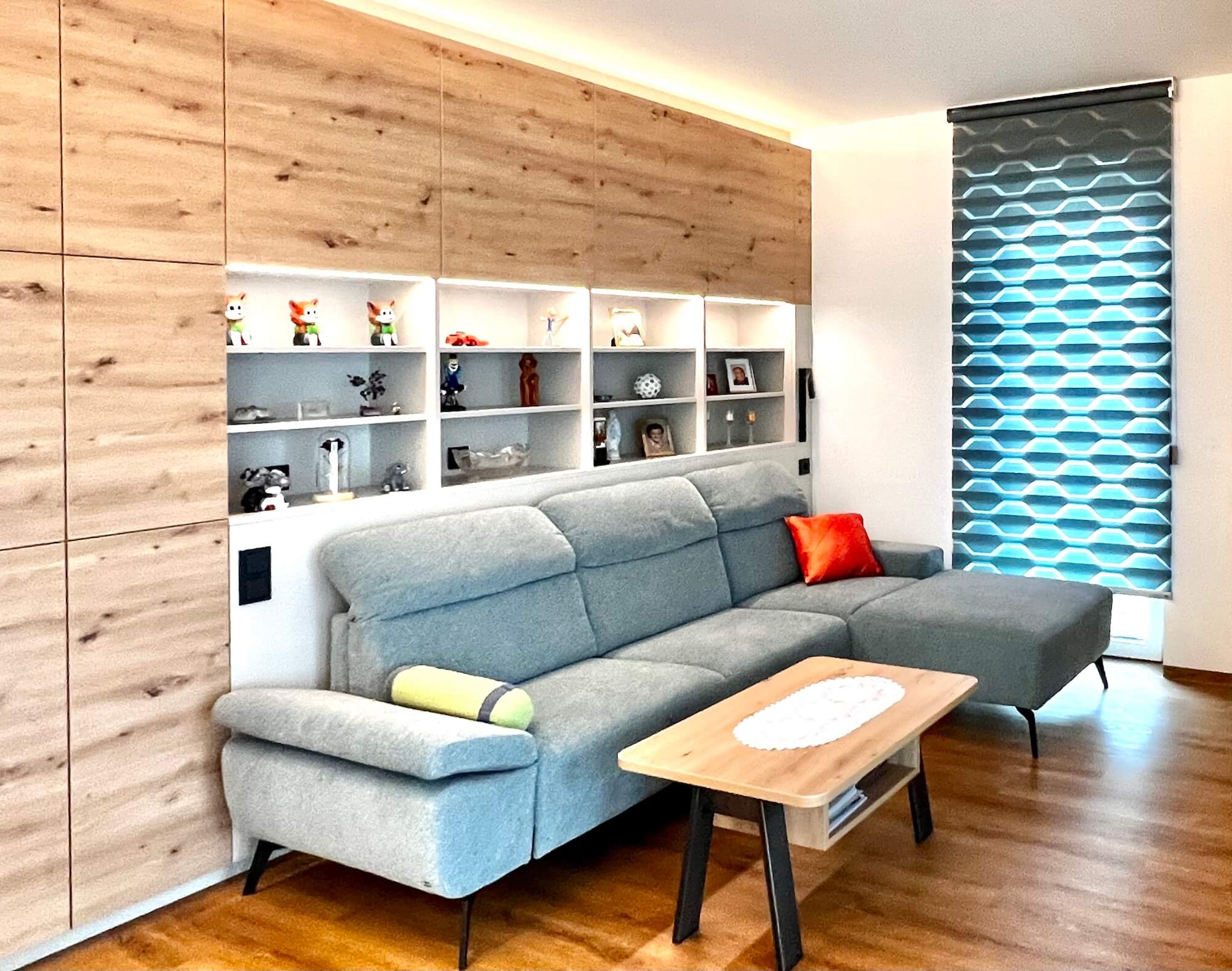Die meisten Stauräume und Schränke sind gewissermaßen unsichtbar in die Wand eingebaut. Wie immer hat das Horst Steiner Team auch alles handwerklich perfekt umgesetzt. Die Familie hat nur einen Ansprechpartner und musste sich um nichts kümmern. Es war sorgenfrei und wurde genauso wie sie es wollten.