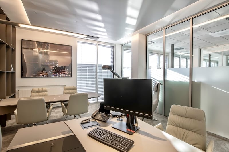 Chefbüro mit Fototapete, Besprechungstisch, Wandbildschirm und großem Schreibtisch