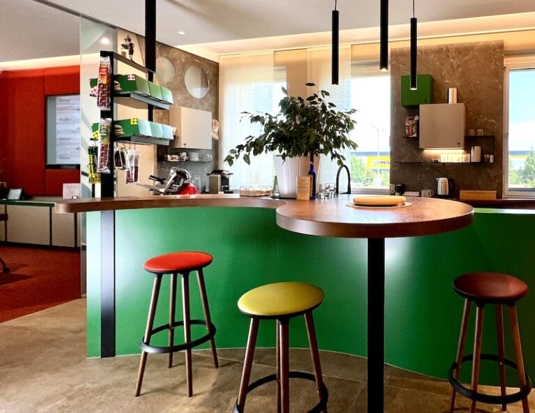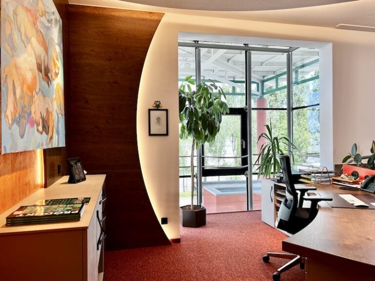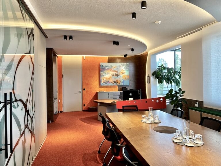 Dieses Büro ist ein Unikat. So viele bunte Elemente in einem Design vereint. Aber der Geschäftsführer ist ein farbiger Typ, sagt er selbst, und möchte einfach jeden Tag mit einem Lächeln ins Büro kommen. Und das ist gelungen. Es hat auch dem Horst Steiner Innenarchitektur-Team Spaß gemacht dies umzusetzen. Beachten Sie übrigens auch das Schweinebild an der Wand 😉