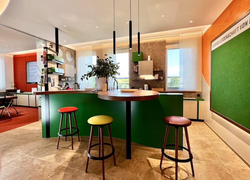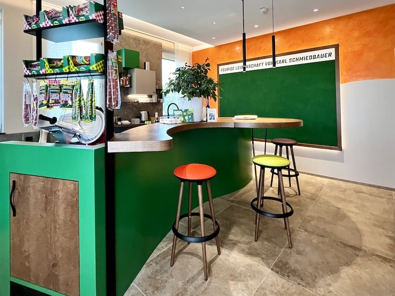 Tja, Wiesbauer ist einer der bekanntesten Wurstfabrikanten in Österreich, da muss alles stimmen. Im Anschluss an das Büro und den Besprechungsteil gibt es eine Küche mit Bar, in der die Produkte verkostet werden können und die Besprechung fidel weitergehen kann. Es zeigt, dass sich Horst Steiner in der Innenarchitektur nicht verewigen will, sondern, dass er sich total anpasst an die Wünsche seiner Kunden und dann mit super Ideen das ganze sorgenfrei mit einer eigenen Mannschaft umsetzt.