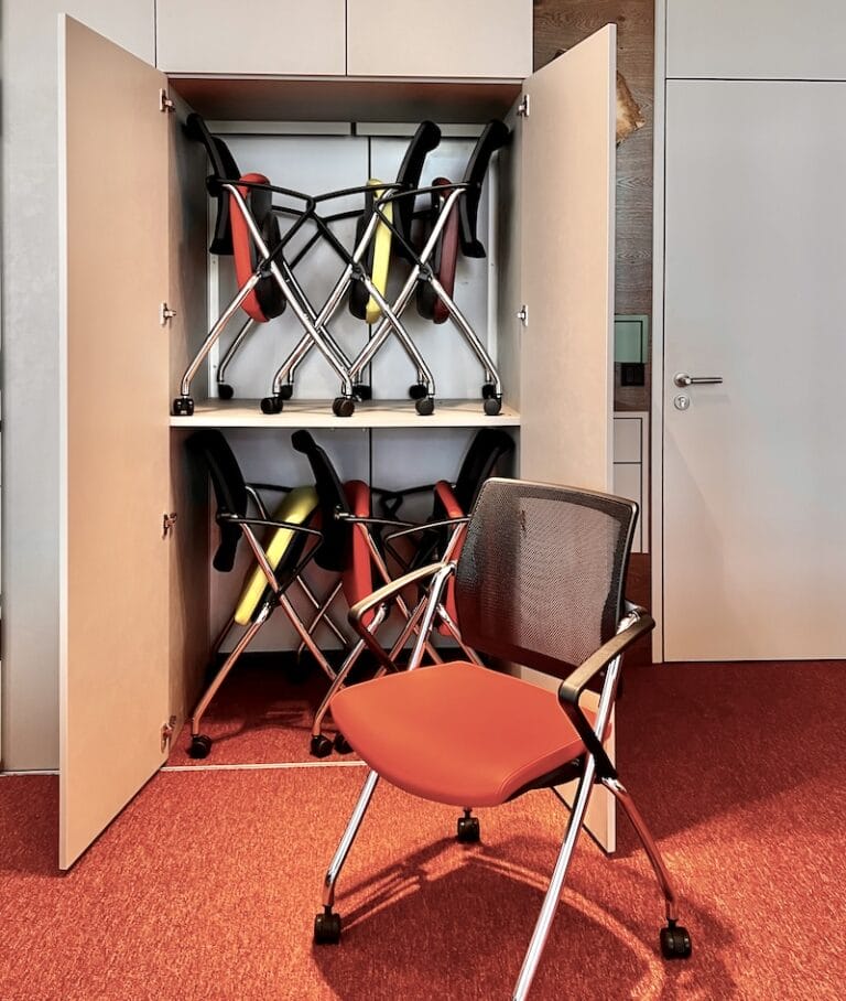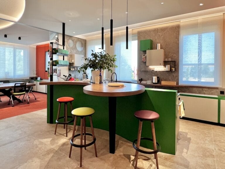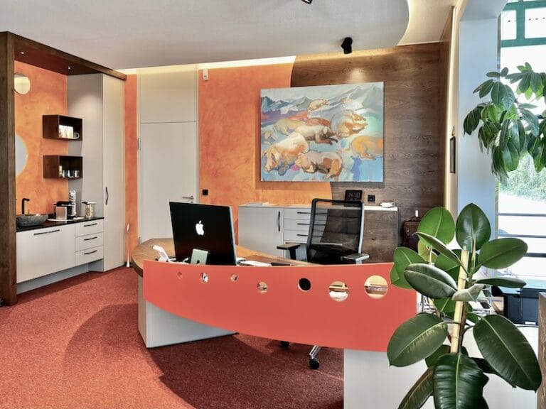 Dieses Büro ist ein Unikat. So viele bunte Elemente in einem Design vereint. Aber der Geschäftsführer ist ein farbiger Typ, sagt er selbst, und möchte einfach jeden Tag mit einem Lächeln ins Büro kommen. Und das ist gelungen. Es hat auch dem Horst Steiner Innenarchitektur-Team Spaß gemacht dies umzusetzen. Beachten Sie übrigens auch das Schweinebild an der Wand 😉