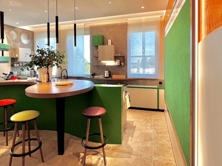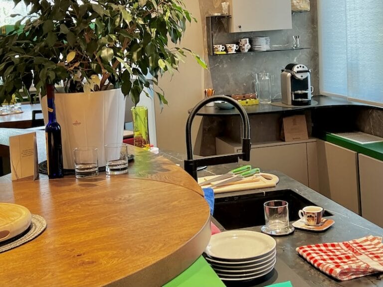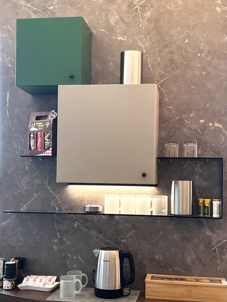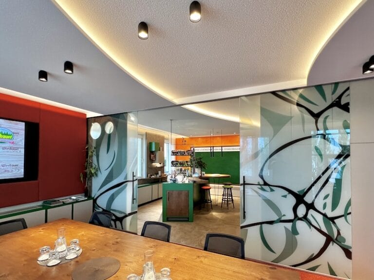 Tja, Wiesbauer ist einer der bekanntesten Wurstfabrikanten in Österreich, da muss alles stimmen. Im Anschluss an das Büro und den Besprechungsteil gibt es eine Küche mit Bar, in der die Produkte verkostet werden können und die Besprechung fidel weitergehen kann. Es zeigt, dass sich Horst Steiner in der Innenarchitektur nicht verewigen will, sondern, dass er sich total anpasst an die Wünsche seiner Kunden und dann mit super Ideen das ganze sorgenfrei mit einer eigenen Mannschaft umsetzt.