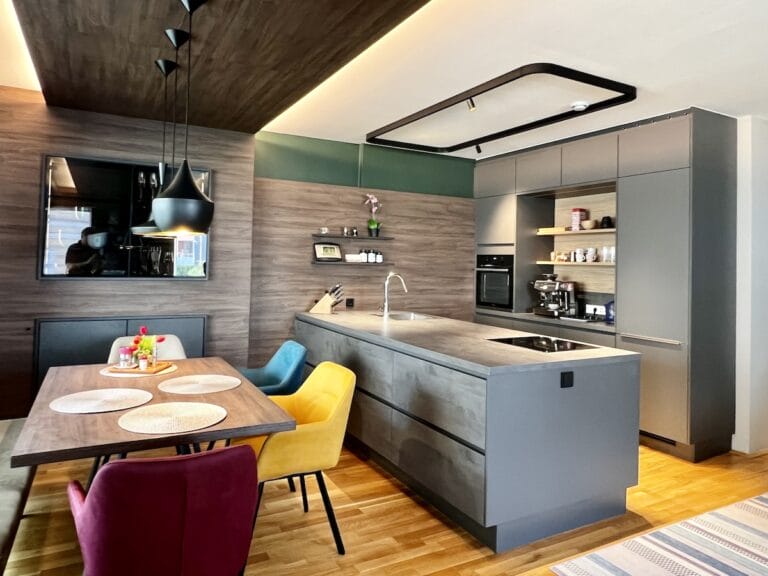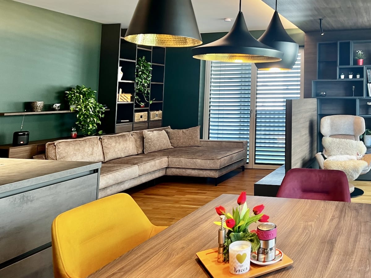 Kreative Raumplanung mit dunklen Farben für schöne Eigentumswohnung in Wels