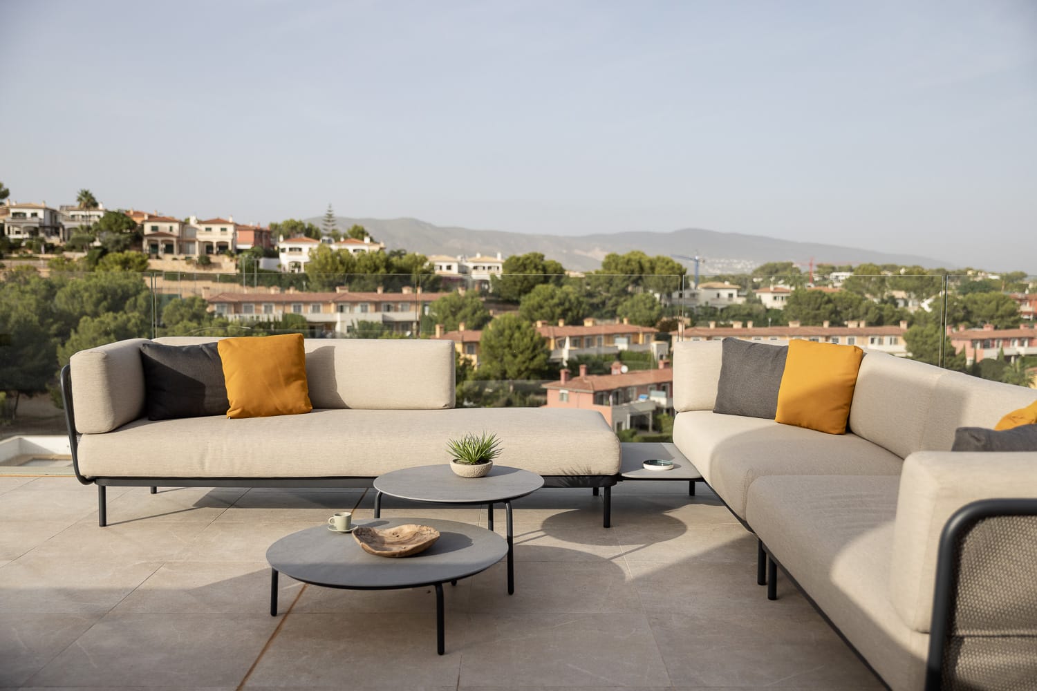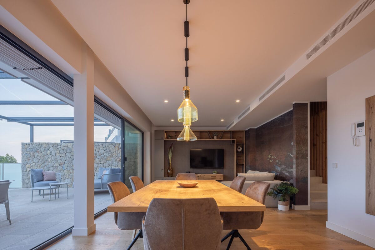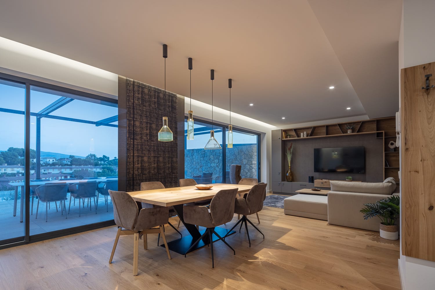 Natürlich war das Konzept für diesen Umbau und die gesamte Innenarchitektur völlig anders. Es sollte ja auch keine Kopie seines Hauses in Österreich sein, sondern zum südländischen Ambiente passen. Besonders auch die Tatsache, dass unser Kunde zwei Außenterrassen von etwa 130 m², einen Pool und einen kleinen Garten sein Eigen nannte, legte nahe, dass er und die Familie viel Zeit im Freien verbringen würden. Unsere Empfehlung, den Innenbereich optisch mit dem Außenbereich zu verbinden war ein Konzept, dass ihm sehr gut gefallen hat.