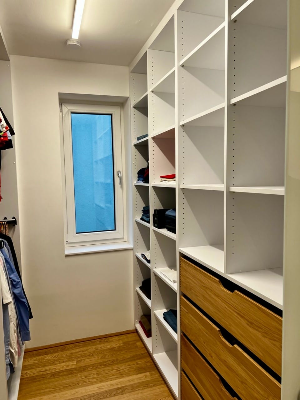 Es fand sich auch noch Platz für einen Schrankraum (neben Bad und Schlafzimmer), der wiederum mit Glastüren abgetrennt wurde und in dem die gesamte Kleidung sauber und ordentlich untergebracht ist.