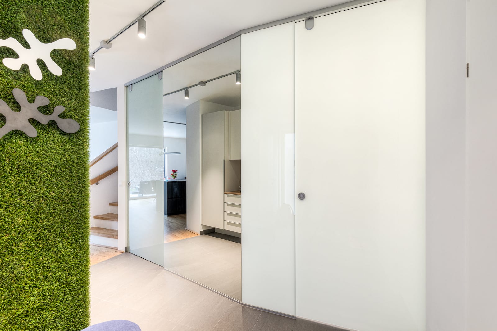 Wie eingangs schon erwähnt, war im ursprünglichen Grundriss ein eher kleiner Eingangsbereich mit kleiner Garderobe geplant gewesen. Durch das Versetzen von Wänden konnten wir einen offenen und einladend wirkenden Flur konzipieren, der neben einer Tagesgarderobe, schöne, große, aber versteckte Einbauschränke mit Unmengen an Stauraum für Sportkleidung, Winterjacken, Schuhe u.v.m. bietet. Dieser Bereich ist mit raumhohen Glasschiebetüren abgetrennt und lässt den Flur deshalb großzügig und vor allem – was unserem Kunden sehr wichtig war – immer aufgeräumt wirken.