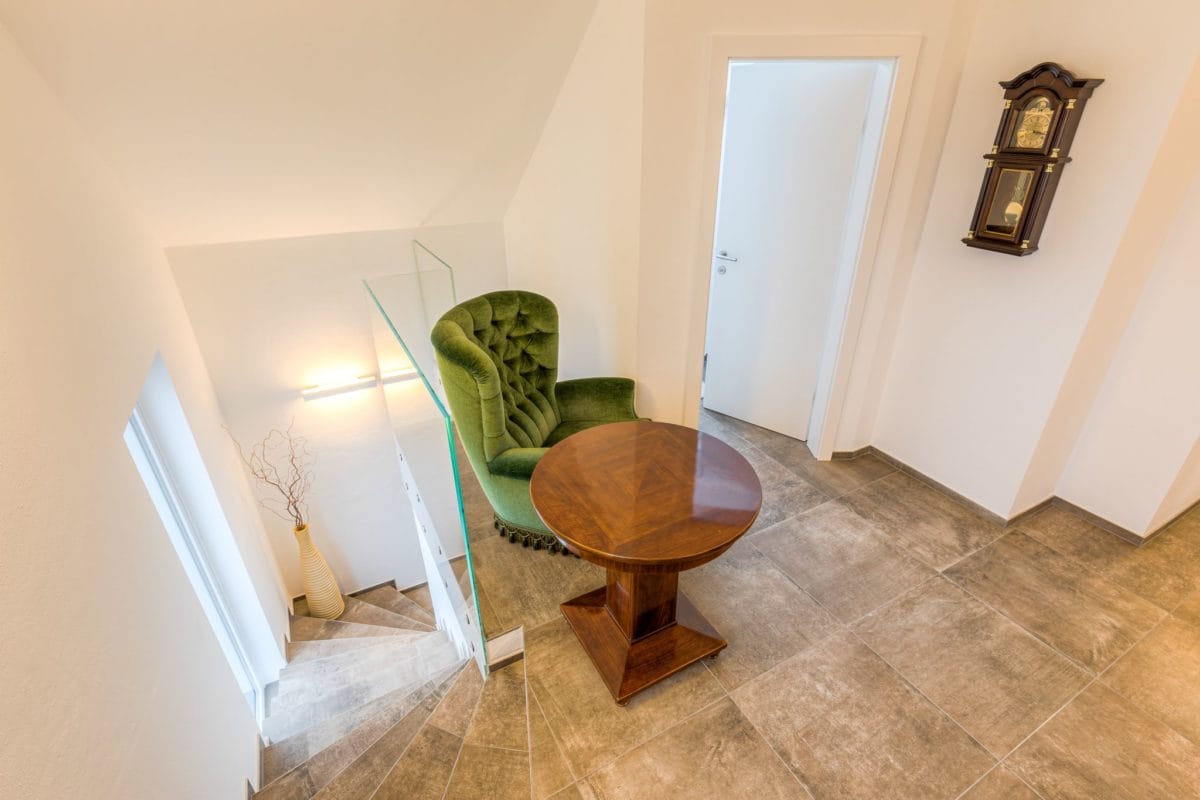 Eine andere, auch sehr reizvolle Option, ist das Hervorheben einzelner Bereiche durch unterschiedliche Bodenmaterialien oder die Möglichkeit große, offene Räume optisch in einzelne Bereiche zu unterteilen. Mehr als zwei unterschiedliche Bodenmaterialien für einen Raum würde ich allerdings nicht empfehlen. Dadurch würden wir uns dann wieder dem Fleckerlteppich nähern.