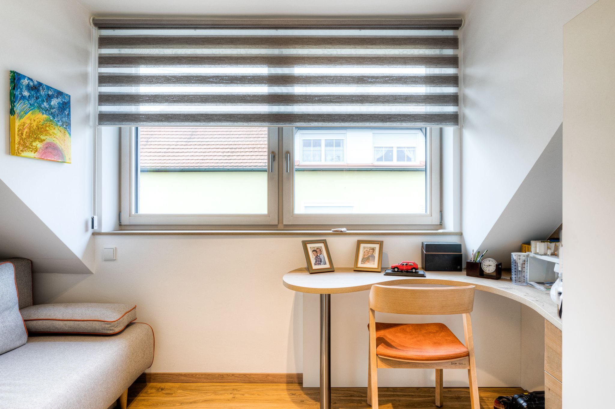 Der angrenzende Gästeraum/Büro verlor natürlich ein paar Quadratmeter und musste dementsprechend gut ausgenutzt werden, um alle Funktionen erfüllen zu können. Auch hier wurden die Dachschrägen mit passenden Möbeln optimal ausgenutzt, sodass der Raum nicht nur etwas Stauraum bietet, sondern auch einen kleinen Schreibtisch und sogar ein gemütliches Sofa mit Bettfunktion für Gäste.