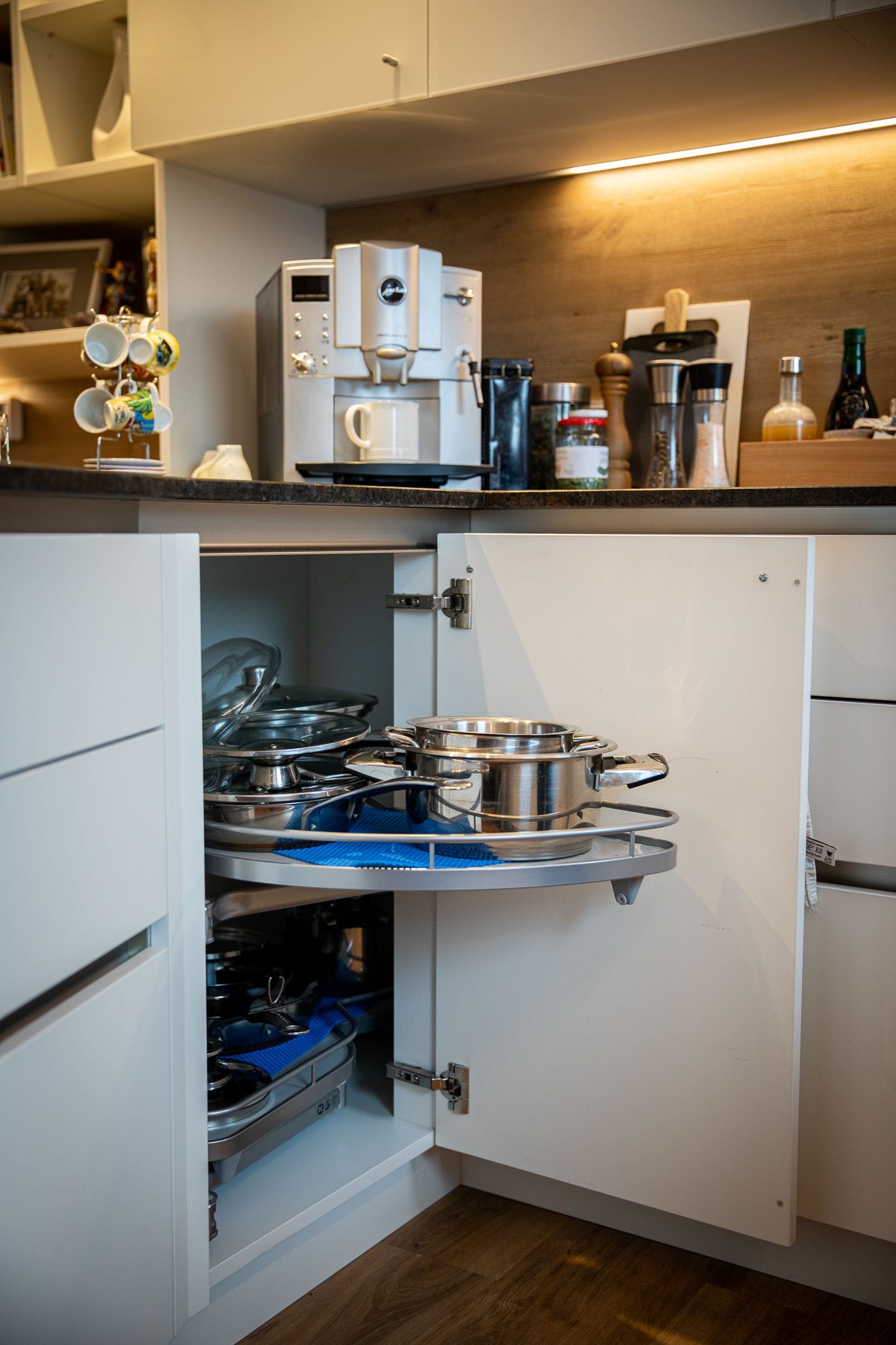 Die vielen Dachschrägen wurden praktisch in die Möbel integriert. Dadurch verlieren sie an Wucht und verschwinden quasi in der Einrichtung. Gleichzeitig wird der darunterliegende Platz optimal als Stauraum sowie für Küchengeräte ausgenutzt. Nicht nur Tageslicht, sondern auch die Beleuchtung war ein sehr wichtiges Thema. Durch die Kombination von verschiedenen Lichtquellen für Arbeits- und Stimmungslicht lässt sich der neue Raum, je nach Bedarf, in verschiedene Stimmungen versetzen. Auch die Beleuchtung der neuen Vitrinen für Gläser und Geschirr verleihen dem Inhalt eine gewisse Besonderheit. Um der bewusst gewählten Geradlinigkeit trotzdem etwas Gemütlichkeit zu verleihen wurde mit einzelnen runden Elementen – wie der Arbeitsplatte der Kochinsel – entgegengewirkt. Alles in allem Entstand eine sehr freundliche, helle und gemütliche Küche mit integriertem Essbereich.